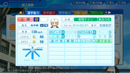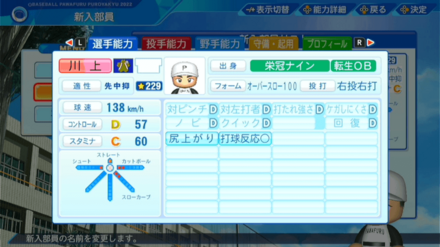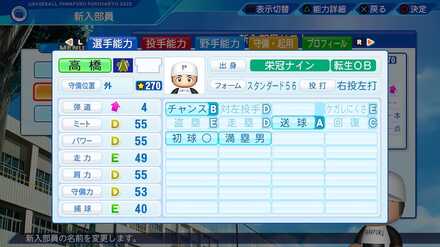 | 弾道 | ミート | パワー | 走力 | 肩力 | 守備力 | 捕球 |