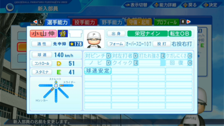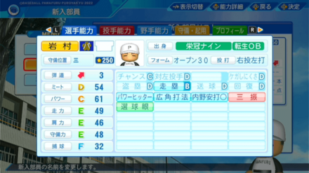 | 弾道 | ミート | パワー | 走力 | 肩力 | 守備力 | 捕球 |