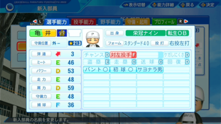 | 弾道 | ミート | パワー | 走力 | 肩力 | 守備力 | 捕球 |