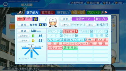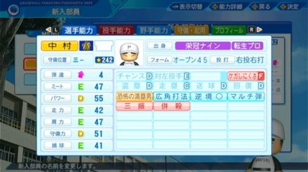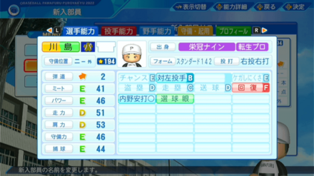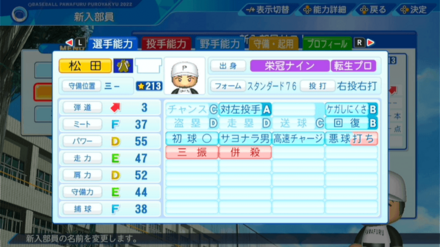 | 弾道 | ミート | パワー | 走力 | 肩力 | 守備力 | 捕球 |