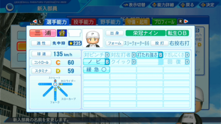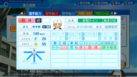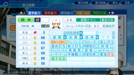 | 弾道 | ミート | パワー | 走力 | 肩力 | 守備力 | 捕球 |