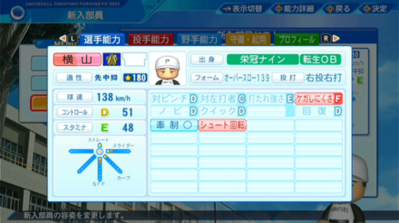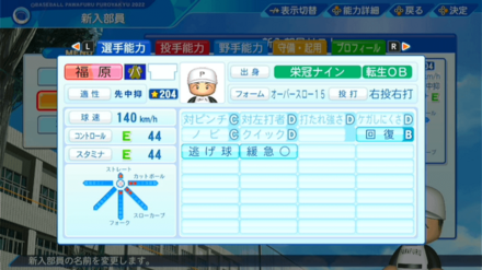 | 弾道 | ミート | パワー | 走力 | 肩力 | 守備力 | 捕球 |