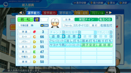 | 弾道 | ミート | パワー | 走力 | 肩力 | 守備力 | 捕球 |