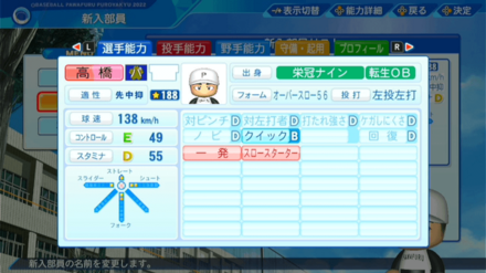 | 弾道 | ミート | パワー | 走力 | 肩力 | 守備力 | 捕球 |
