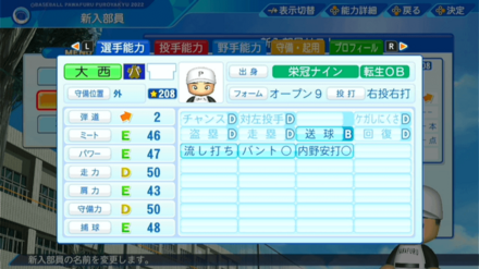 | 弾道 | ミート | パワー | 走力 | 肩力 | 守備力 | 捕球 |