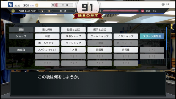 練習設備は、土日の試合後か行動日におでかけでスポーツショップに訪れると購入できます。どの練習設備も一律500万円で購入が可能です。