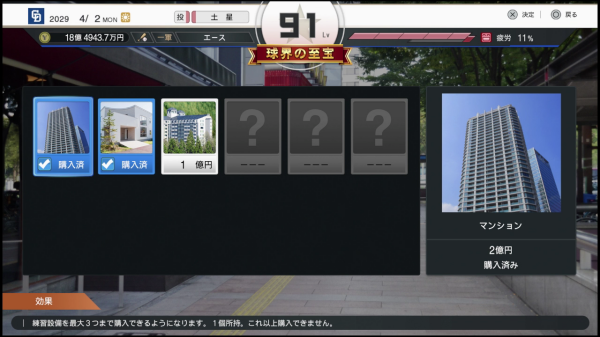 | マンション | 2億円 | 練習設備を最大3つまで購入できる |