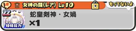 「蛇皇剣神・女媧」を入手するには、2022/11/16(水)~2022/11/30(水)現在、「妖怪三国志コラボイベント第4弾」開催期間中に「女神の間(レア)」をLv10までクリアする必要があります。