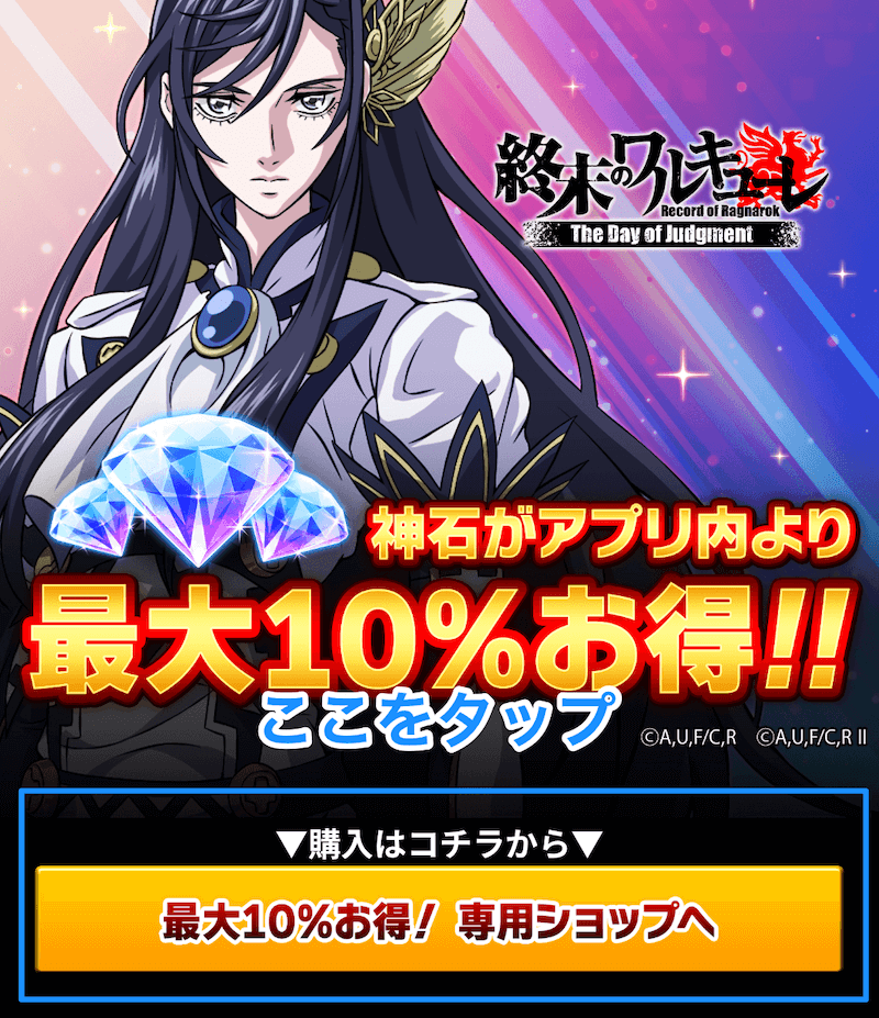 終末のワルキューレDOJにおけるお得に神石を購入できる専用ショップについての記事です。神石をお得に購入したい方はぜひご覧ください。