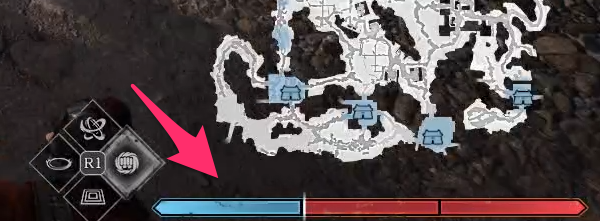 拠点を制圧すると拠点の端にツボが出現し、攻撃して壊すと体力回復や、回復アイテムの「肉まん」を補充することができます。制圧中に削られた体力はここで回復しておきましょう。