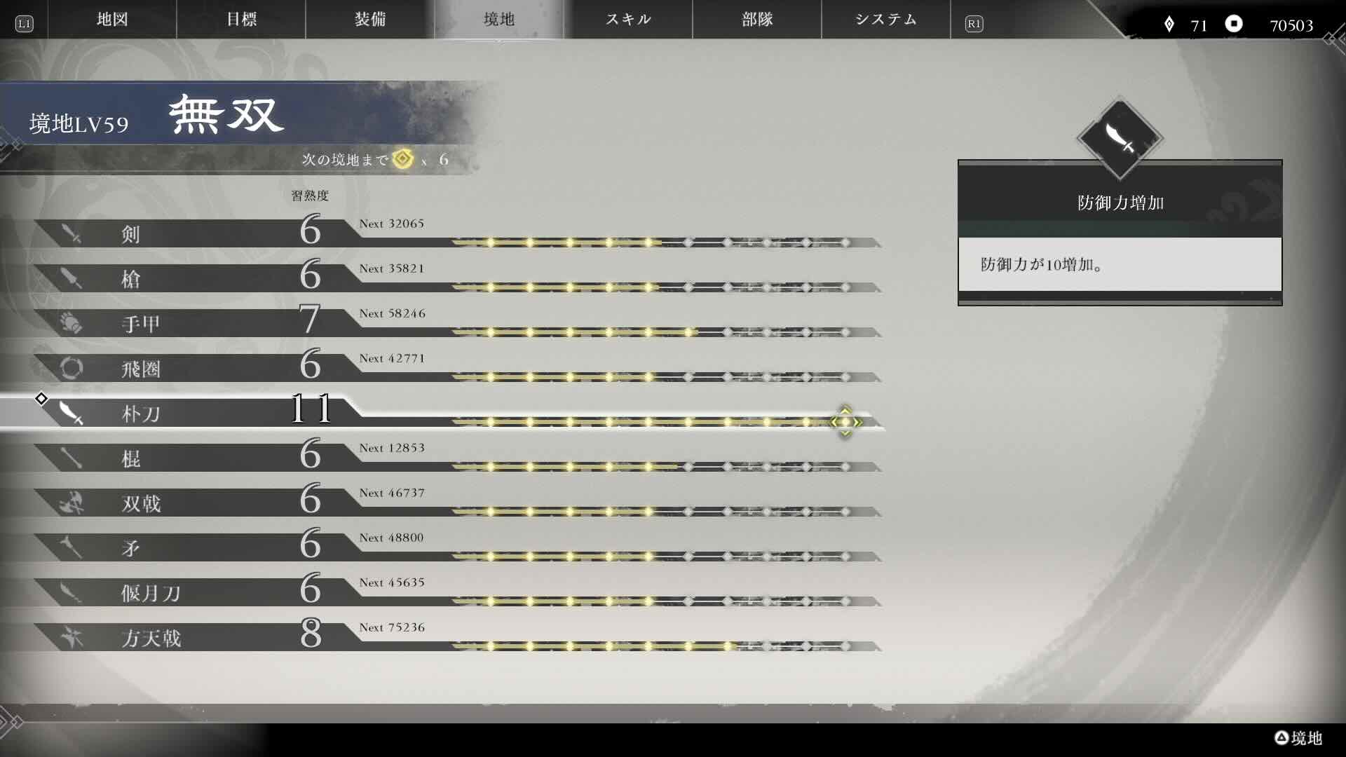 習熟度の上限が解放されるとともに、境地レベルの上限も上がって、新境地「真・無双」が解放されます。習得するためには、武器種の合計習熟度が65必要です。