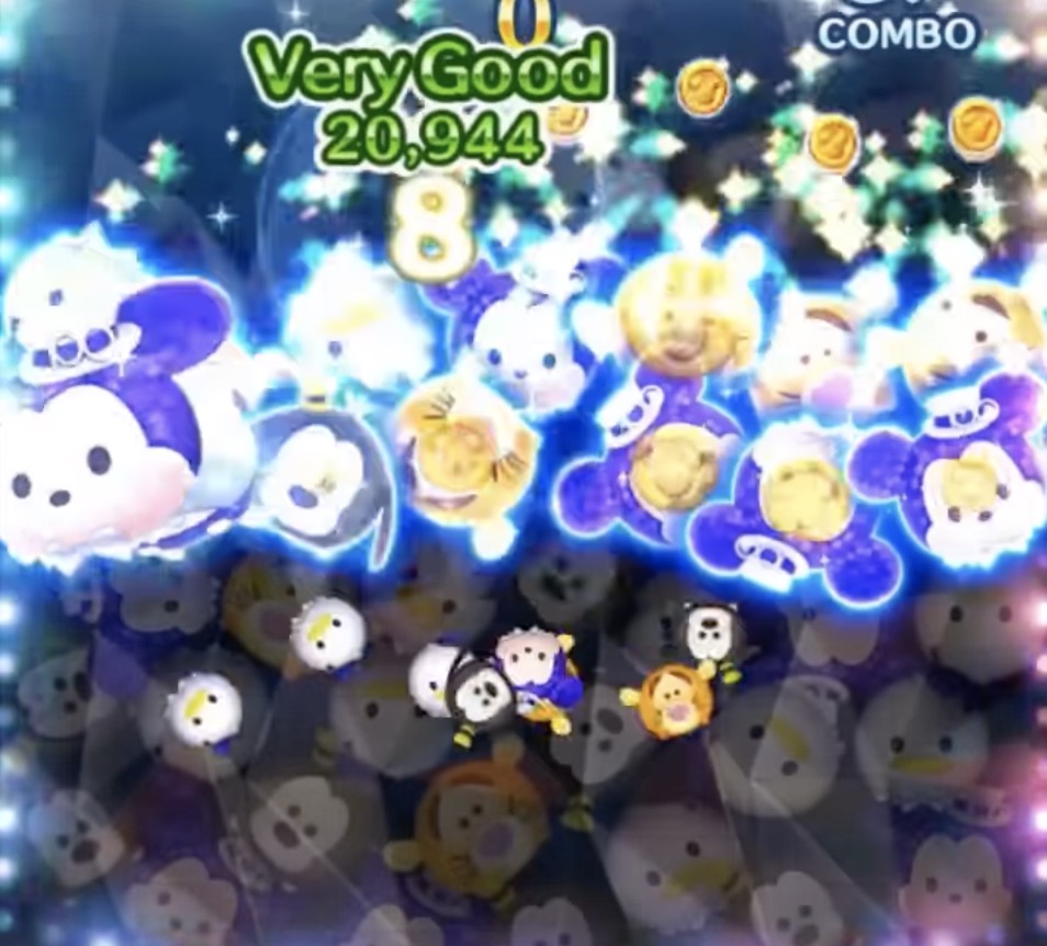 同時発動時のタップ消去で、青白く変化したミッキー、ミニー、ドナルド、デイジーを消した時だけコイン補正マイナス2段階がかかります。その効果時間中に降ってくる他のツムには補正はかかっていません。