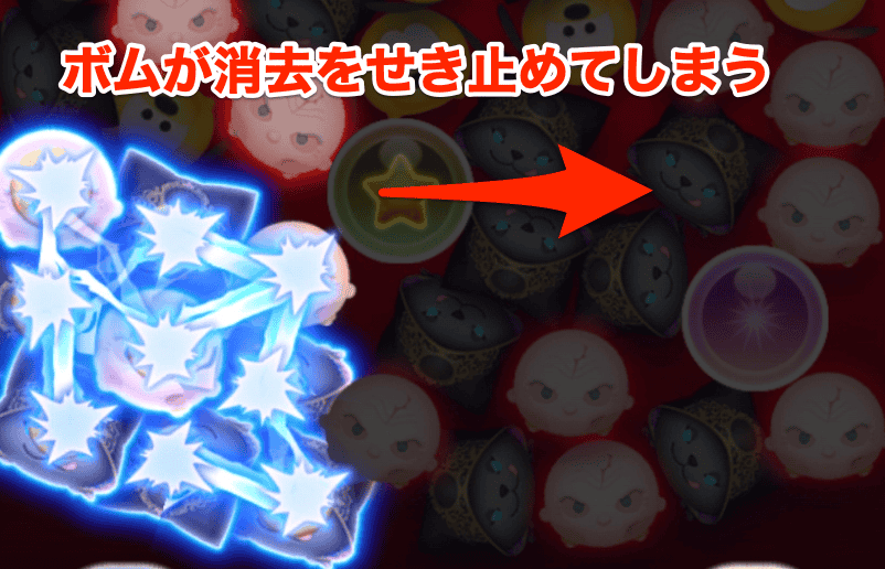 スノークのスキル発動前にある程度画面上のボムは消しておきましょう。スキル中にボムの周辺でチェーンを作ってしまうと、ボムがチェンの最後尾と隣接するツムをせき止めてしまい、最大限に消去数を出すことができなくなります。