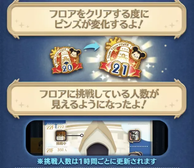 ミッションをクリアしてツムを積み上げていくと次のフロアに進むことができます。どんどん繰り返して、タワーを登っていきましょう。