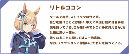 「リトルココン」はクールでストイック、金色の髪が特徴的なウマ娘です。自分を曲げることが嫌いなので集団行動に苦手意識を持っていますが、情に厚い一面も持ち合わせます。また、ファッションには強いこだわりがあるようです。