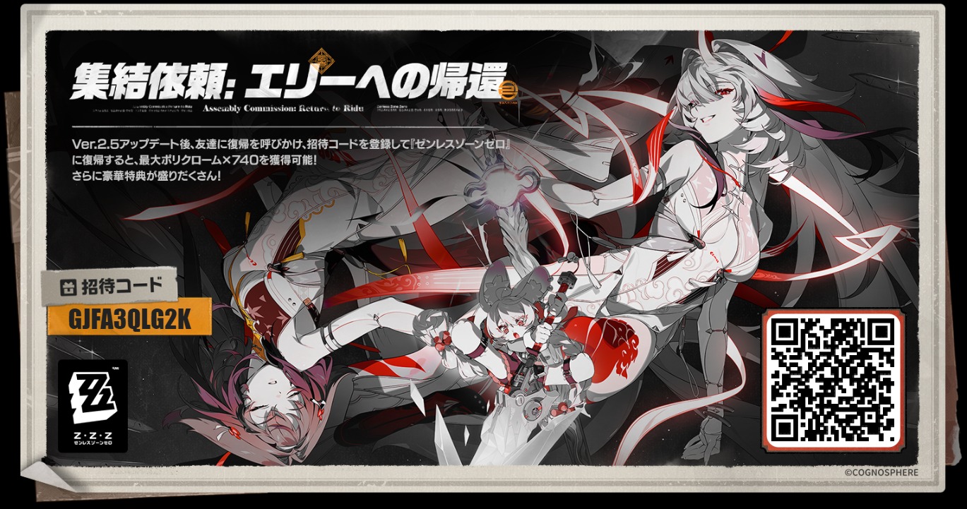招待コード GJMA4QFG2K 友達に『ゼンレスゾーンゼロ』への復帰を呼びかけて招待コードを登録すると、最大740ポリクロームを獲得可能!さらに抽選でゲーム機、フィギュア、グッズ、ポリクロームなど豪華報酬も! https://hoyo.link/jtFJX60gz?s_c=GJMA4QFG2K